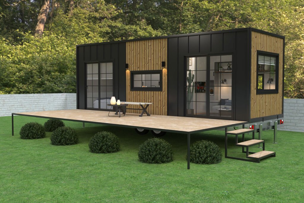 Model 04 is the latest member of our "Flat" series, blending minimalism with industrial elegance. Designed for those who prefer stair-free, level living, this model invites nature indoors through its massive glass facades. The living area, separated by a central bathroom unit, elevates studio comfort to its peak.