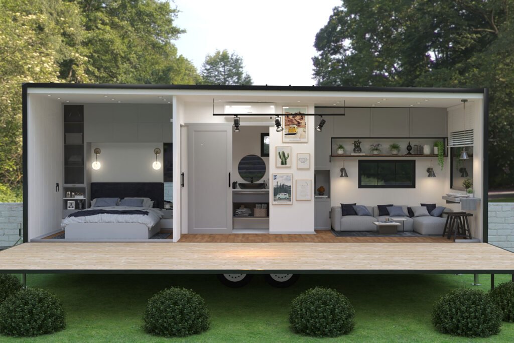 * Images showcase the actual Model 04 design data. Modern flat roof and compact studio-style interior are standard.