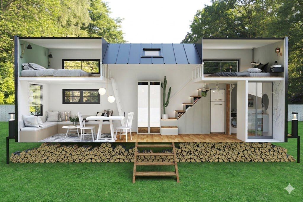 Uzdaş Twin Loft (Model 05), konaklama kapasitesini maksimuma çıkaran çift asma kat yapısıyla kalabalık aileler için en ideal çözümdür. Üç farklı modülün birleşiminden oluşan tasarımı, orta kısımda yüksek tavanlı bir gökyüzü penceresi ile ferahlık sağlar. Beyaz dikey siding ve antrasit geçişlerin uyumu, dış cephede zamansız bir estetik sunar.